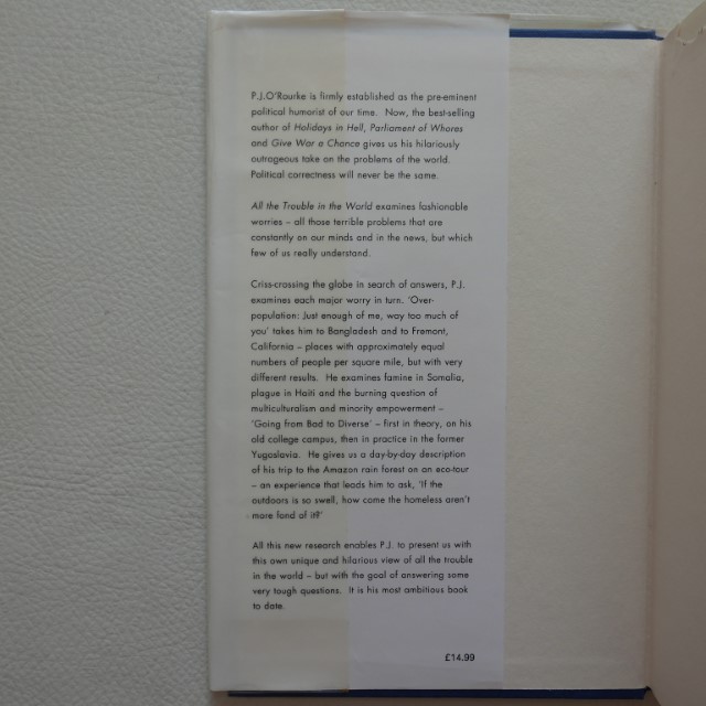 With All the Trouble in the World, P. J. O’Rourke once again landed on best-seller lists around the country, confirming his reputation as the pre-eminent political humorist of our time. Attacking fashionable worries – all those terrible problems that are constantly on our minds and in the news, but about which most of us have no real clue – P. J. crisscrosses the globe in search of solutions to today’s most vexing issues, including overpopulation, famine, plague, and multiculturalism, and in the process produces a hilarious and informative book which ensures that the concept of political correctness will never be the same again. “One of the funniest, most insightful, dead-on-the-money books of the year.” – Los Angeles Times; “All the Trouble in the World is O’Rourke’s best work since Parliament of Whores.” – The Houston Post; “The dispatches are unfailingly funny….Mr. O’Rourke gets to the heart of the matter with a steady stream of wisecracks….Economists, political scientists and sociologists are inclined to approach the ills of society with regression analysis. P. J. O’Rourke just points and laughs. Not surprisingly, it is Mr. O’Rourke who gets it right.” – The Washington Times; “Bottom Buy the book.” – The Wall Street Journal.