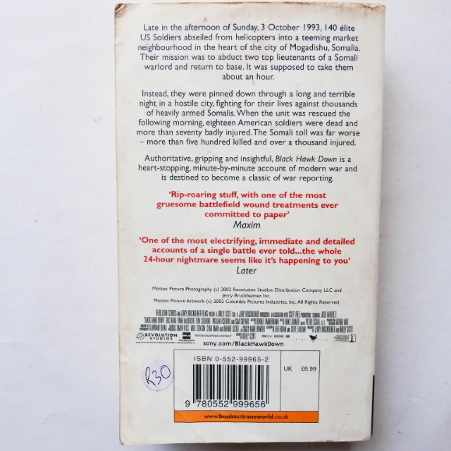 On October 3, 1993, about a hundred U.S. soldiers were dropped by helicopter into a teeming market in the heart of Mogadishu, Somalia, to abduct two top lieutenants of a Somali warlord. The action was supposed to take an hour. Instead, they spent a long and terrible night fighting thousands of armed Somalis. By morning, eighteen Americans were dead, and more than seventy badly injured. Mark Bowden’s gripping narrative is one of the most exciting accounts of modern war ever written–a riveting story that captures the heroism, courage and brutality of battle.