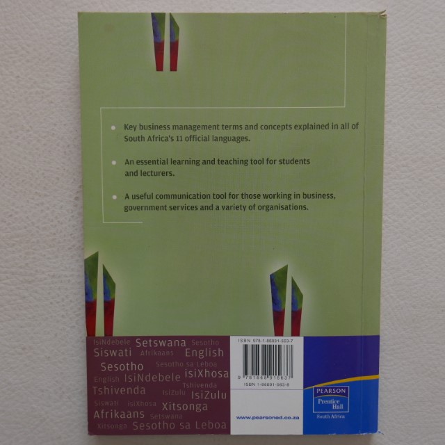The Multilingual Glossary of Business Management Terms is a well-researched and insightful book of business and management definitions. They are listed alphabetically and cross-referenced in a clear, concise and easy to understand format as well as in 11 South African languages. The book contains over 80 terms all taken from subjects which flow into the vast arena of business and management. It is informative and illuminating and provides the interconnectivity and substance which every resourceful and enterprising manager, business student or discerning member of the public will find indispensable. In essence, the book will serve as a compass to help navigate and unfurl the sometimes unfamiliar and confusing terminology that has become all too pervasive in today’s dynamic business and management environment.