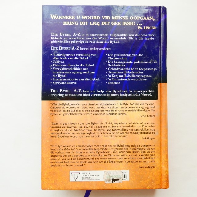 Die Bybel A-Z is ‘n omvattende hulpmiddel vir élke gelowige. Dit is ideaal vir elke gelowige wat erns maak met sy geloof en die Bybel beter wil verstaan. Dis die ideale kaart vir enige leser se ontdekkingsreis deur die Bybel, van A tot Z!