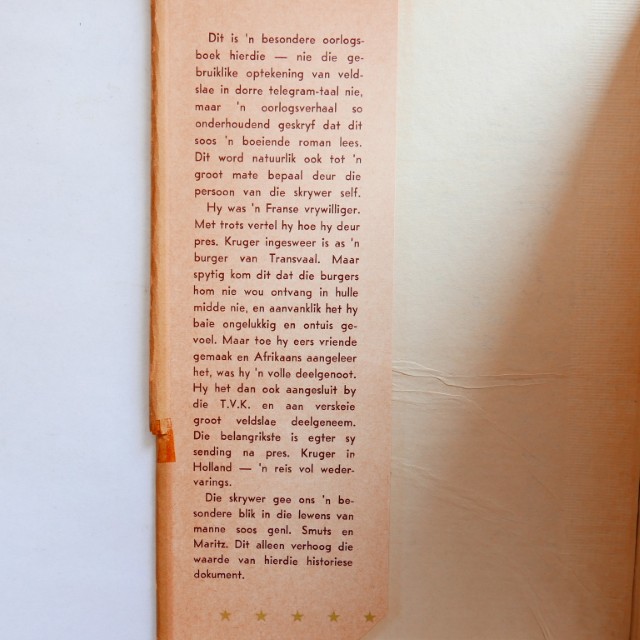 Die skrywer gee ons ‘n besondere blik in die lewens van manne soos Genl. Smuts & Genl. Maritz. Dis ‘n besondere oorlogs-boek hierdie, nie die gebruiklike optekening van veldslae in dorre tellegram-taal nie.