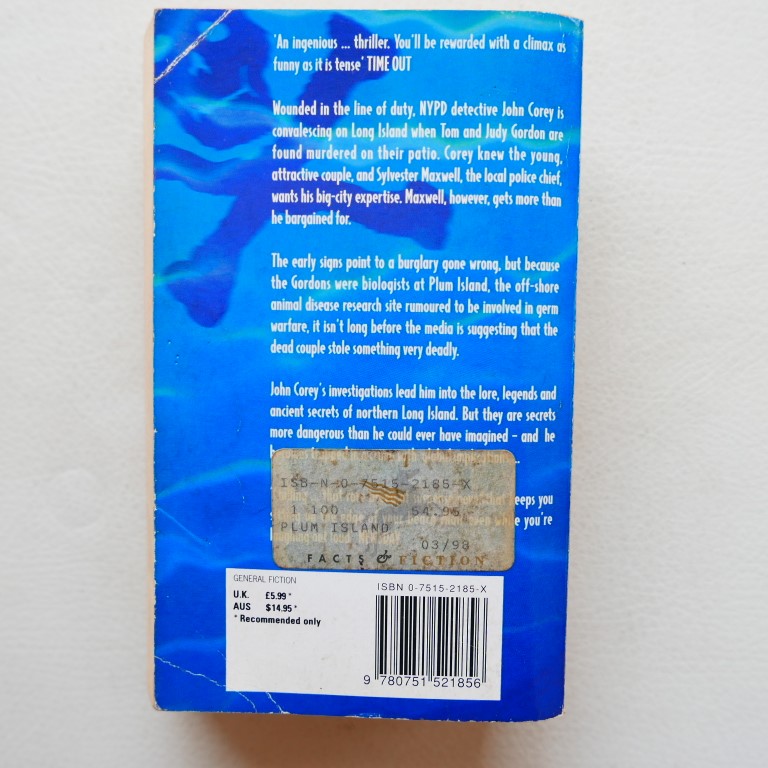 Wounded in the line of duty, NYPD homicide cop John Corey is convalescing in rural eastern Long Island when an attractive young couple he knows is found shot to death on the family patio. The victims were biologists at Plum Island, a research site rumored to be an incubator for germ warfare.