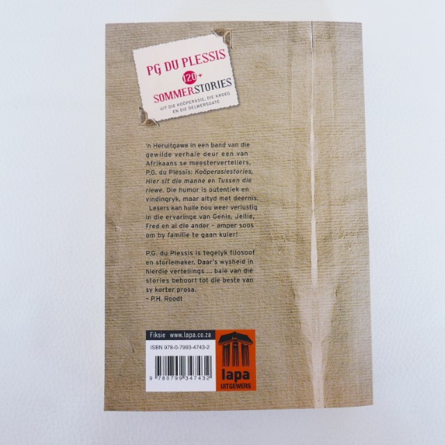 ‘n Heruitgawe in een band van die gewilde verhale deur een van Afrikaans se meestervertellers P.G. du Plessis: Kooperasiestories, Hier sit die manne en Tussen die riewe. Die humor is outentiek en vindingryk, maar altyd met deernis.