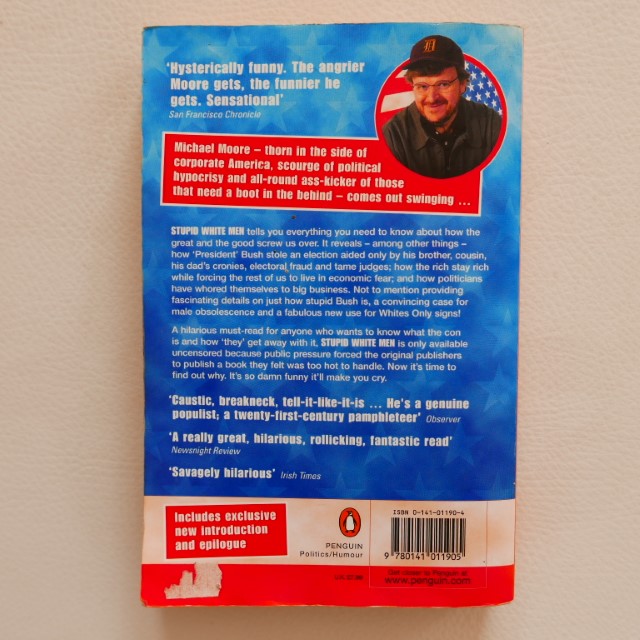 Michael Moore sizes up the new century – and that big, ugly special-interest group that’s laying waste to the world as we know stupid white men. Whether he’s calling for United Nations action to overthrow the Bush Family Junta, calling on African-Americans to place whites only signs over the entrances of unfriendly businesses, or praying that Jesse Helms will get kissed by a man, “Stupid White Men” is Mike’s manifesto on malfeasance and mediocrity.