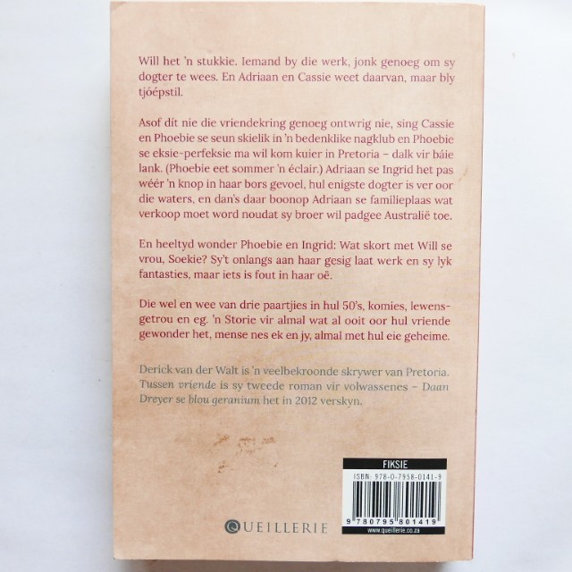 Will het ’n stukkie. Iemand by die werk, jonk genoeg om sy dogter te wees. En Adriaan en Cassie weet daarvan, maar bly tjóépstil. Asof dít nie die vriendekring genoeg ontwrig nie, sing Cassie en Phoebe se seun skielik in ’n bedenklike nagklub en Phoebe se eksie-perfeksie ma wil kom kuier in Pretoria – dalk vir báie lank. (Phoebe eet sommer ’n éclair.) Adriaan se Ingrid het pas wéér ’n knop in haar bors gevoel, hul enigste dogter is ver oor die waters, en dan’s daar boonop Adriaan se familieplaas wat verkoop moet word noudat sy broer wil padgee Australië toe. En heeltyd wonder Phoebe en wat skort met Will se vrou, Soekie? Sy’t onlangs aan haar gesig laat werk en lyk fantasties, maar iets is fout in haar oë. Die wel en wee van drie paartjies in hul 50’s, komies, lewensgetrou en eg. ’n Storie vir almal wat al ooit oor hul vriende gewonder het, mense nes ek en jy, almal met hul eie geheime.